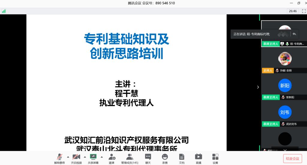 5月1日,为提高大学生对专利的了解,学会利用知识产权保护自身智力成果。williamhill英国中文邀请武汉泰山北斗专利代理事务所合伙人,学院2011届校友程千慧女士为2019级同学进行了一场有关专利基础知识的讲座。学院党委副书记刘韦老师、辅导员王娟老师参加活动,讲座由孙毅老师主持。
