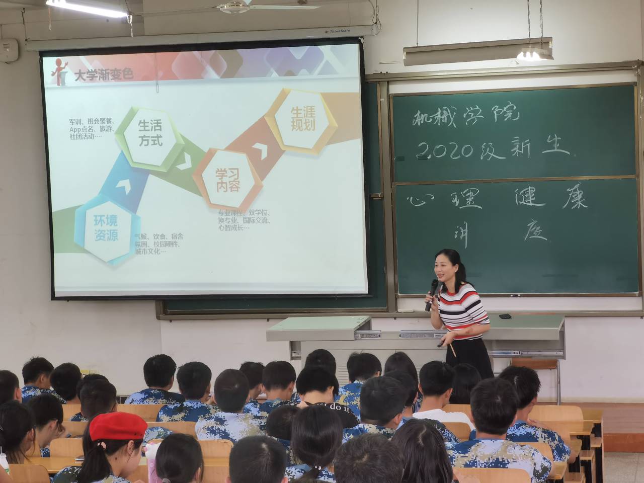 林凡老师首先为同学们讲解大学开学新生的心理状态的改变,以及之后要面对的大学生活,要求同学们升级心态调整,升级自我认识,升级关系处理。随后,林凡老师围绕三个板块一一与同学们互动。一是疫情影响回顾,心态成长。二是提出大学变化,适应生活。提出大学生命线的理念。大学要自觉自省,自律自强,自我认同。三是进入大学要学会进化,提出埃克里森的心里社会发展八阶段。要从自知到自主。林凡老师还详细为同学们从多个方面分别介绍大学未来四年的资源、选择与规划,以及大学期间不同心理健康状态的区别和健康心态的重要性。