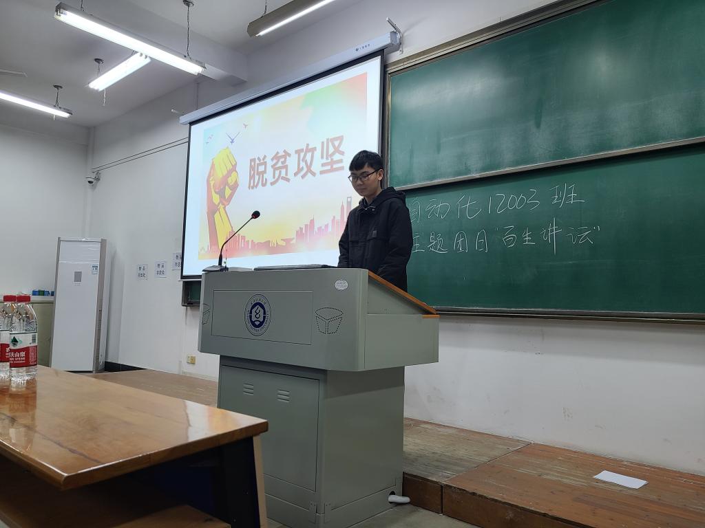 2020年是全面建成小康社会目标实现之年,是全面打赢脱贫攻坚战收官之年。活动中,自动化12003班团支部郭大伟以我身边的精准扶贫故事为题,向大家介绍了他的家乡在国家精准扶贫战略下发生的巨大变化以及一个个感人至深的扶贫故事。机械11807班团支部饶灿灿同学向大家分享赴武汉市民之家参观“人民至上,生命至上”抗击新冠肺炎疫情专题展览的收获与体会。六个主题内容展区,近千张珍贵照片与实物,再现了那场波澜壮阔的抗疫大战,生动的诠释了中国共产党不惜一切代价,保护人民生命安全和身体健康的责任与担当。
