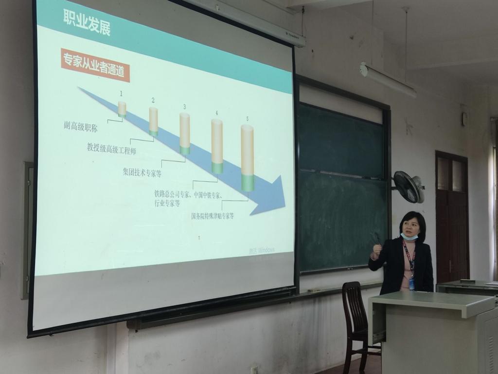 活动中,文文从个人工作经历出发,首先向大家介绍了中铁科工集团的发展情况、企业荣誉、社会担当以及在行业内四位一体的竞争优势。然后,从该集团负责研制的悬挂式轨道交通空轨江夏试验线运营情况为切入点,向大家详细介绍了我国基建领域高铁施工设备、盾构机设备、海工机械、矿山设备,以及其他高端智能制造设备的发展情况,进一步让学生了解到所学专业与国家基建行业发展的紧密联系。
