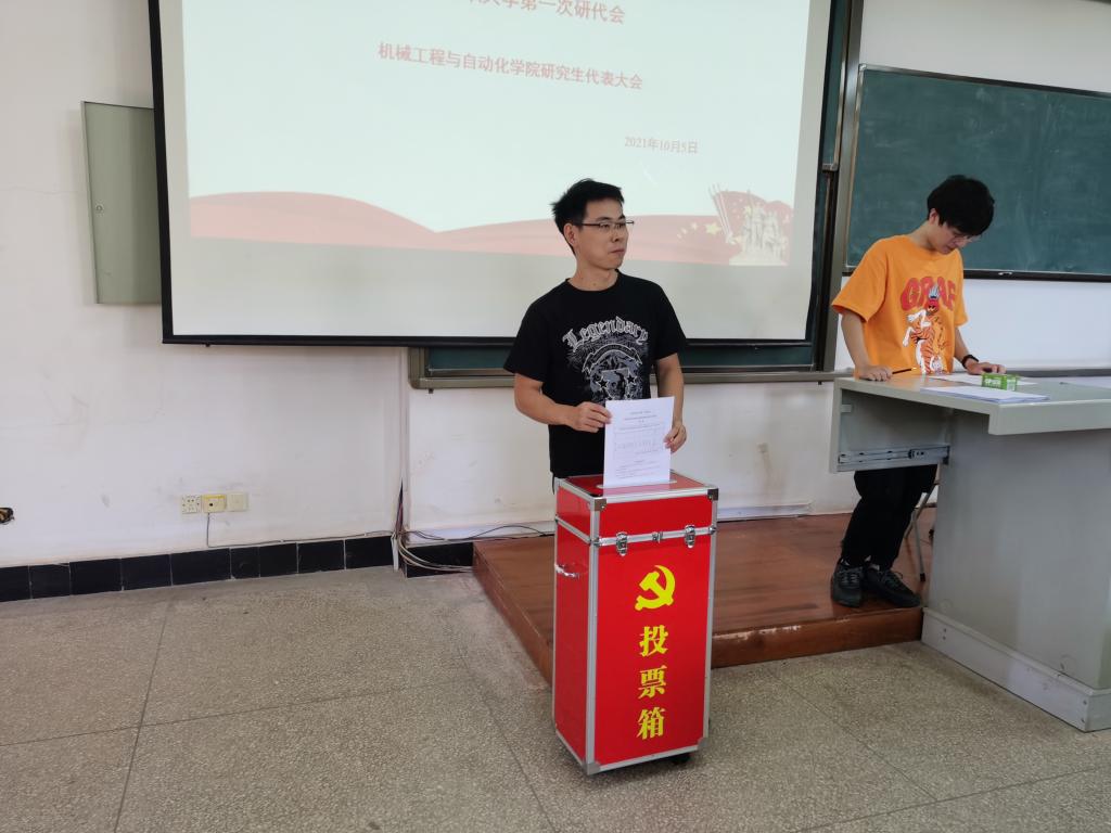 会议分为上午10:30研19级、20级的会场和中午1:10研21级的会场,分别由李海涛和杨晋宇同学主持。会议在雄壮的国歌声中拉开帷幕,介绍了学校第一次研究生代表大会基本情况,介绍了学院研究生代表大会准备情况,介绍了学院研究生代表大会代表和委员会候选人情况,介绍了学校第一次研究生代表大会提案工作情况,介绍了监票人、计票人,最后进行了会议选举。