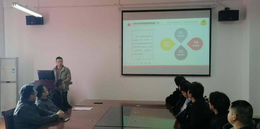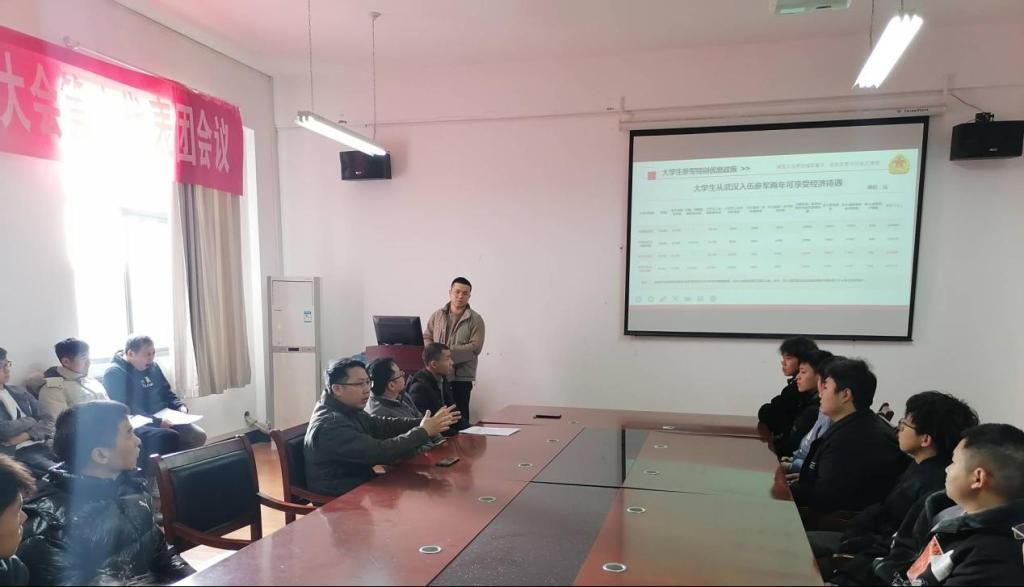 为进一步贯彻落实国家大学生应征入伍政策,扎实推进大学生应征入伍工作,帮助大学生了解、掌握应征入伍相关政策和流程,鼓励大学生积极应征入伍献身国防事业。在退役大学生资助工作周中,williamhill英国中文于12月14日在学院征兵工作站举办“淬炼成刚——大学生应征入伍政策宣讲会”,会议由学院征兵联络员方林主讲,学院党委副书记刘韦、毕业生辅导员梁祥云以及有意参军入伍的全体同学参与了本次宣专题讲会。