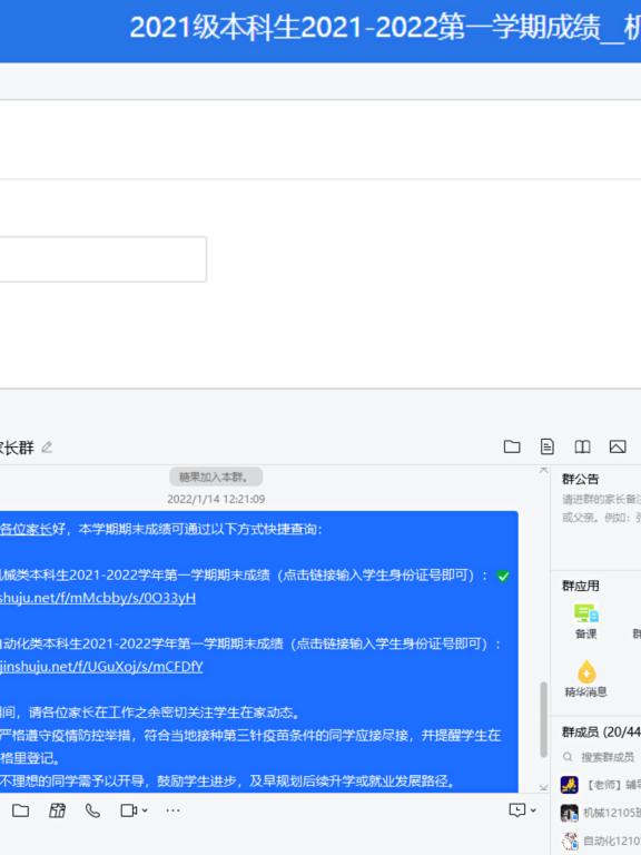 寒假伊始,学院进行全员云家访,通过制作专属的一封信和家校联系反馈表,告知家长学生在校情况的同时获取学生家长对学生及学校最真实的想法和建议,同时利用家长群发布学院最新消息,及时了解最新动态。学院经过多方调研后采用了数据平台供学生家长使用,只需点击链接输入学生身份证号即可查询本学期所有成绩,极大地增进了家长对孩子们的了解和关注,便于家长们更有针对性地教育引导子女。