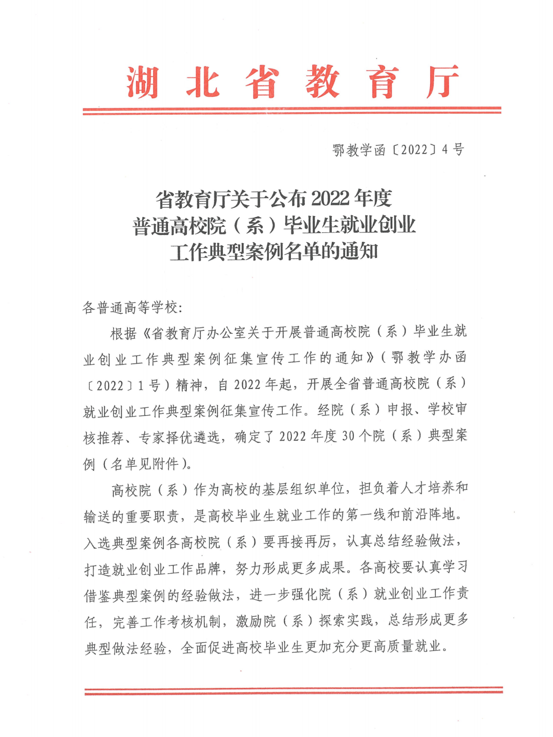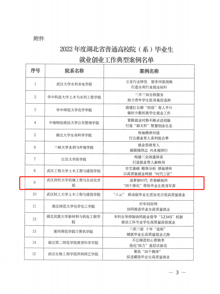 为总结推广工作中的典型经验做法,选树一批可学习、可借鉴、可推广的优秀案例和工作品牌,总结形成更多典型做法经验,促进全省高校毕业生更加充分更高质量就业,省教育厅启动了全省普通高校毕业生就业创业工作典型案例总结宣传工作,经各地各高校申报推荐,专家择优遴选,共确定30个典型案例。近日,湖北省教育厅公布了2022年度普通高校院(系)毕业生就业创业工作典型案例遴选结果,WilliamHILL中国机械工程与自动化学院就业工作案例《逐梦新时代 青春献祖国——“四个强化”帮扶毕业生投身军营 》经过学校审核推荐、专家择优遴选,最终脱颖而出,成功获评湖北省普通高校院(系)毕业生就业创业工作首批典型案例。