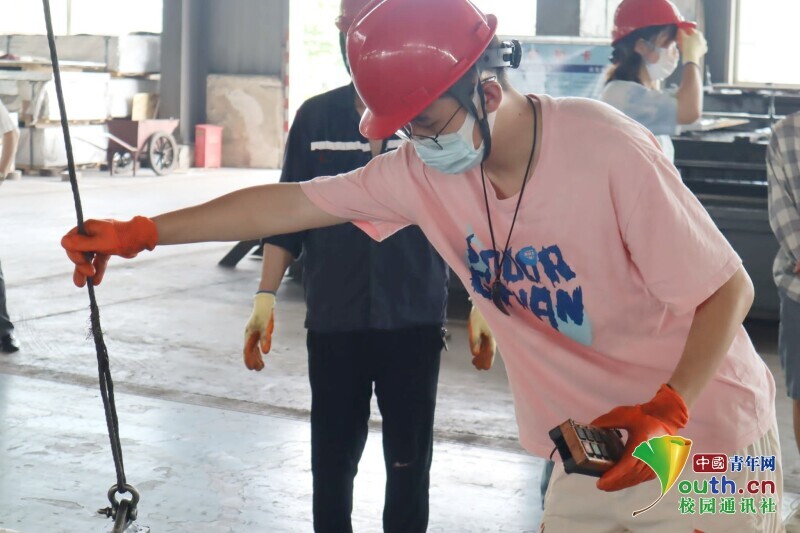 图为在专业的工作人员带领下,团队成员利用探测仪对已完成加工的合金进行检查。中国青年网通讯员 吴家萱 供图