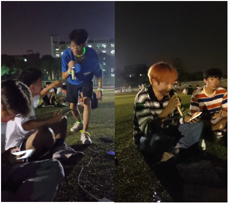 晚上,学院同学们在田径场草地上席地而坐,共同聆听音响中传来的美妙歌声,回忆多姿多彩的童年,共同庆祝美好的国庆节,每当自己熟悉的歌声响起时,同学们都会慷慨激昂,一起合唱起来。