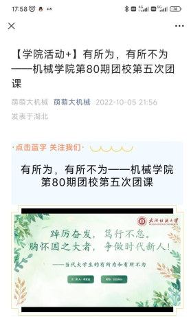 占领多平台教育阵地。新时代大学生是使用网络媒体的最大群体,2022级新生辅导员从线上迎新开始,在学院官方公众号“萌萌大机械”、官方抖音号“机械剪影”及个人手机QQ空间、微信朋友圈发布多条思政教育相关推文,持续运用新媒体新技术推动思政课常态化、长效化;在学生常用的平台上,以活泼的语言、诙谐有趣的拍摄手法,制作发布与大学生息息相关的话题和视频,引导学生主动汲取积极健康的内容,建立阳光向上的世界观和人生观;组织学生团体拍摄制作了系列思政教育主题的视频,用大学生喜闻乐见的表达方式创新思政课形式,积极扩展网络思政课的多元形式。