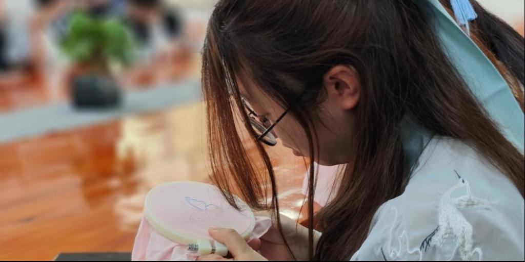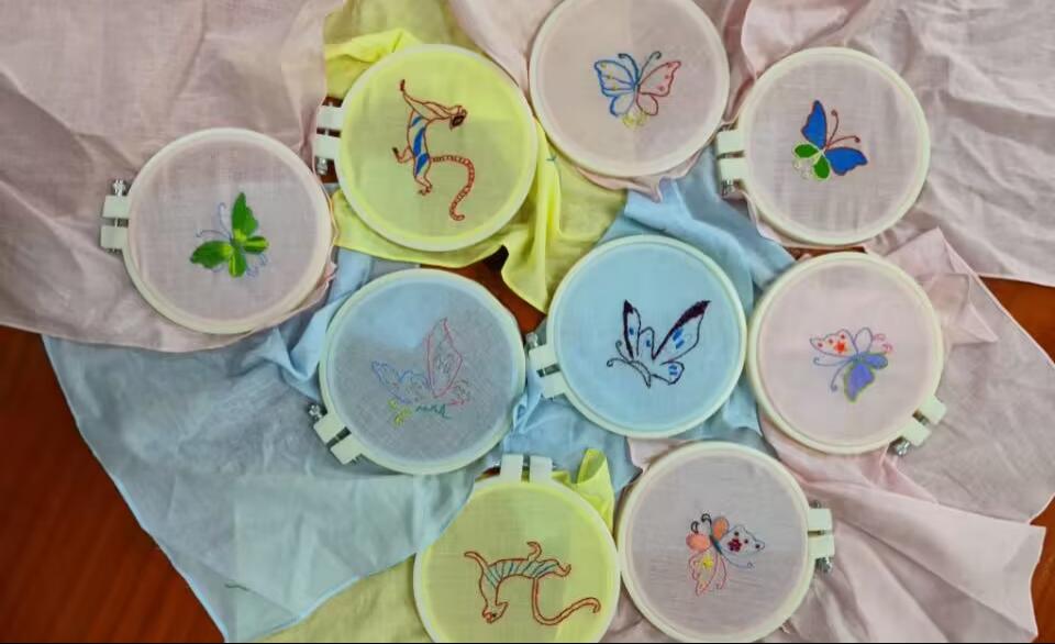 走进荆楚汉绣文化体验区,郎老师介绍到汉绣文化起源于武汉,特点是构思大胆,色彩浓艳,画面丰满,装饰性强,处处流露出楚风遗韵。随后,在郎老师和非遗社团的同学们的指导下,铁人班学员学会了打针,滚针等几个汉绣针法,并且用心体验着汉绣技艺并制作自己的作品,经过2个多小时的努力,同学们的作品得到了老师同学们的赞赏和肯定,通过近距离的接触与实际体验,铁人班学员深刻地感受到了汉绣的精细感,更加领会到了传统文化的珍贵。