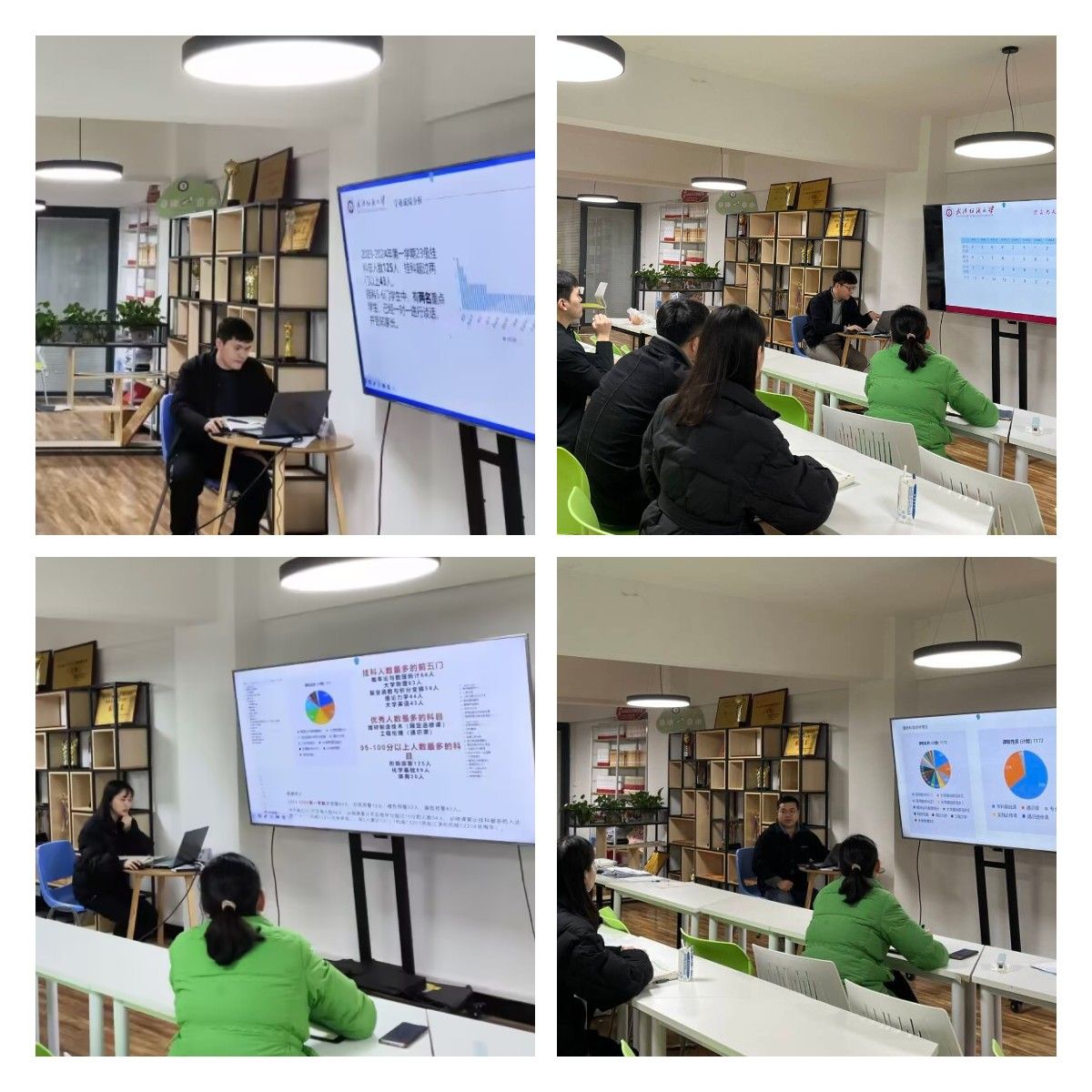 各年级辅导员从“学生基本情况总结”、“期末成绩情况分析”、“学风建设工作开展情况”及“下一步工作的重点”等方面进行汇报。结合学生的专业特点,每位辅导员的汇报数据详实、内容丰富、各具特色,提出的典型经验和做法值得相互借鉴学习。