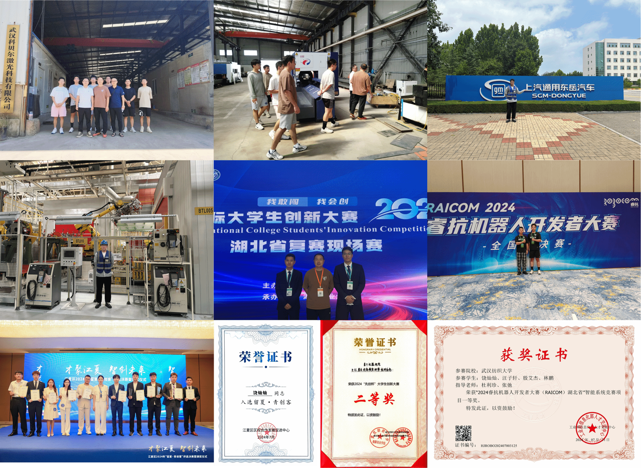 8月,团队成员前往湖北省武汉市的武汉科贝尔激光科技有限公司和烟台的上汽通用东岳汽车有限公司进行了参观学习。团队深入了解了行业中公司的先进技术和运营模式,对团队科技创新项目的开发和应用有了更深的理解。通过与公司技术人员的交流,团队成员收获了宝贵的经验,为参赛项目提供启发,获得湖北省银奖。而后,团队队长饶灿灿又参加了2024睿抗机器人开发者大赛,荣获全国二等奖。