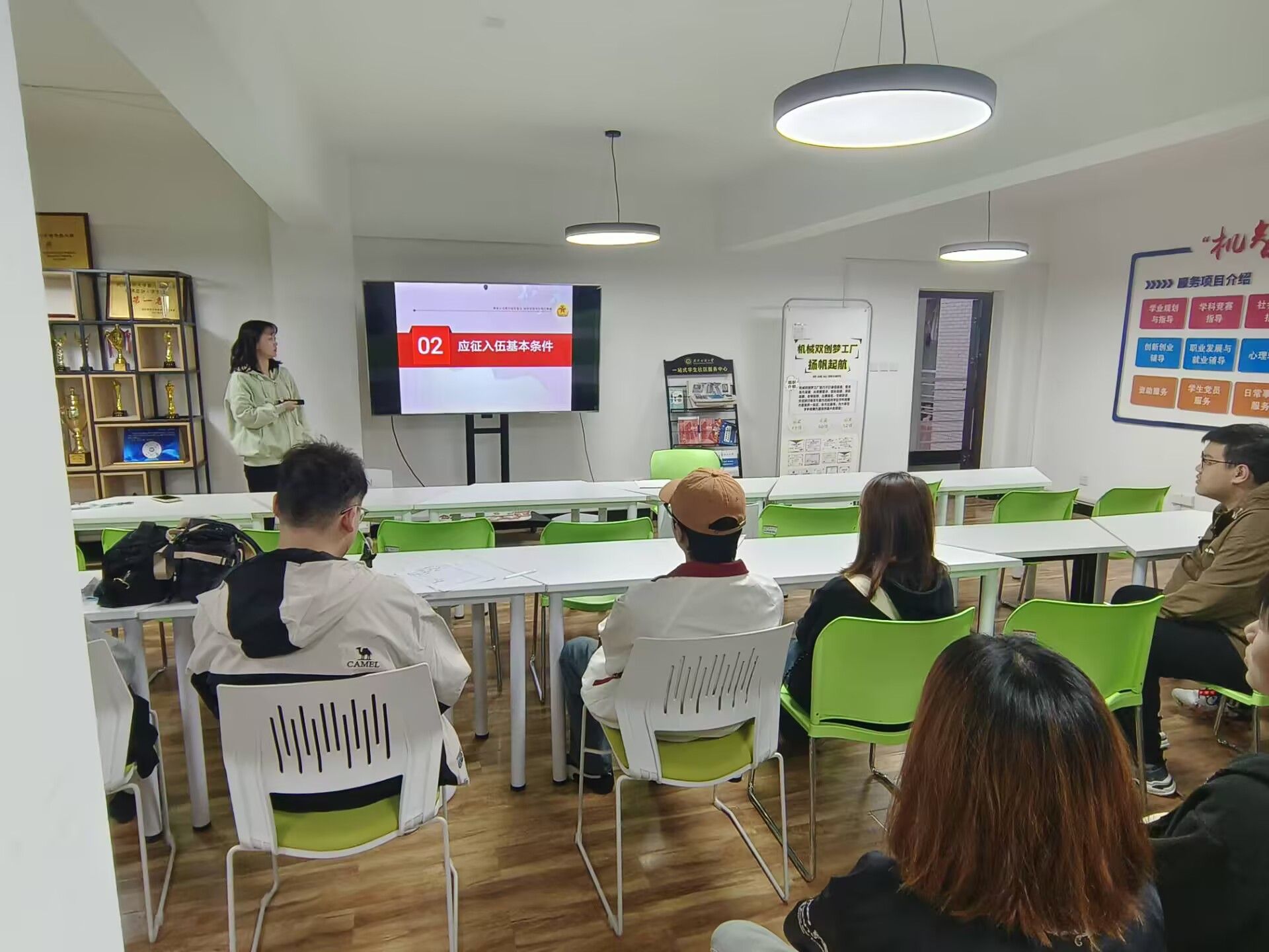 各班同学共同参加征兵宣传主题班会,从部队简介、应征入伍基本条件、入伍流程、大学生参军特别优惠政策、军营生活等方面详细了解了2025年征兵政策。2021级同学特别关注了毕业生参军的优待政策,在心中埋下了参军入伍的种子。据悉,针对2024级新生,学院进行了专题讲座,普及入伍相关政策和路径规划,对未来择业有了新的认识,增强同学们保家卫国的决心。