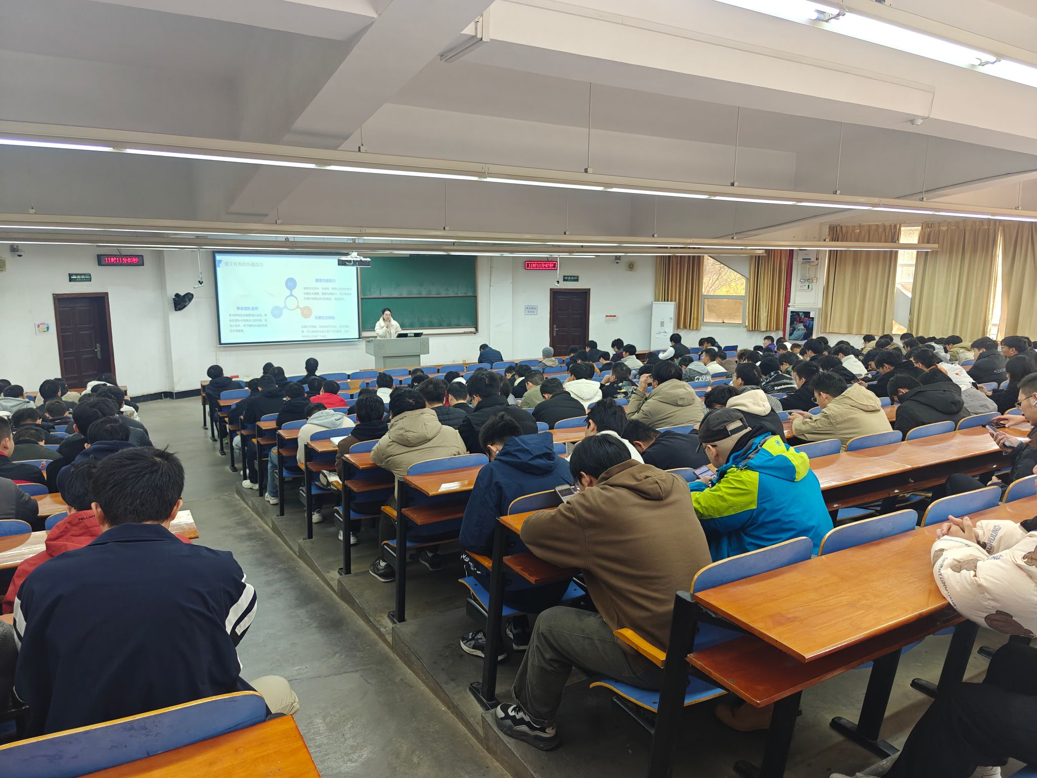 随后,付老师从心态调整、学术研究、生活方式、职业规划、人际交往和心理健康等六个方面为切入点,与大家进行了深入的分享。她鼓励同学们要保持积极乐观的心态,面对困难和挑战时能够勇往直前,并强调了严谨治学的重要性,希望同学们不断探索未知领域,追求学术真谛;同时,她还提倡健康向上的生活方式,提醒同学们注重身体健康,培养良好的生活习惯,并引导同学们明确自己的目标定位,制定合理的职业规划;最后,她提醒同学们要关注自己的心理健康状况,学会自我调节和释放压力。