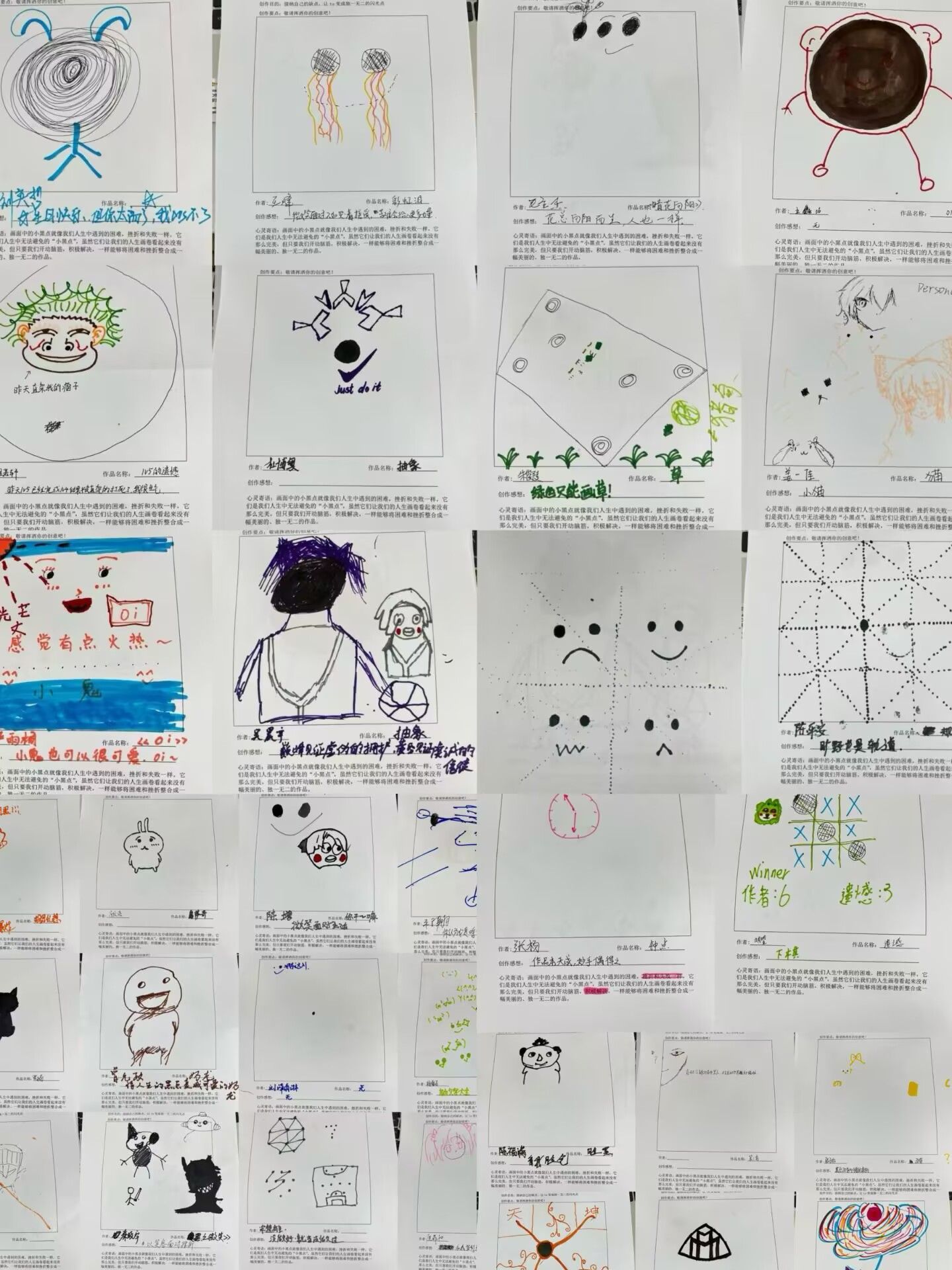 随后,张静怡手持一张画有小黑点的白纸,引导下同学们静下心来,闭上眼睛,在内心深处探寻属于自己的那一个个“小黑点”。在“小黑点具象化”环节,同学们拿起画笔,在白纸上将内心的小黑点一一描绘出来。在绘画过程中,教室里弥漫着一种凝重而又专注的氛围,同学们仿佛在与自己的内心进行一场深度对话。当完成绘画后,同学分享着自己的小黑点,而每一次分享都伴随着同学们真诚的安慰、实用的建议和满满的鼓励。大家开始用彩色笔在小黑点上进行创作。他们发挥自己的想象力和创造力,将一个个单调的小黑点变成了一幅幅充满希望与活力的画面。“请和我击掌”环节把活动气氛推向了高潮。同学们自由在场地中穿梭,主动向他人伸出手,请求击掌。每一次击掌都伴随着一个真诚的微笑和一句积极的话语,通过这个简单而有力的互动,同学们不仅收获了满满的正能量,还打破了彼此之间的隔阂,增强了班级的凝聚力与向心力。