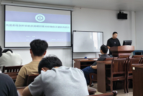 陈威同学分享了“高速柔性剑杆织机织造碳纤维3D织物的关键机构研究”,旨在解决使用传统织造方法制造复杂结构的碳纤维3D织物时遇到的技术难题。研究的重点在于优化和改进现有剑杆织机的关键机构,以适应碳纤维材料的特殊性质及其对织造工艺的要求。这包括设计更高效的引纬机构,确保碳纤维纱线能够在高速运转条件下被精确引入织物中而不受损。张老师鼓励学生们进行跨学科的合作,比如与材料科学和计算机科学领域的专家合作,共同攻克技术难关。