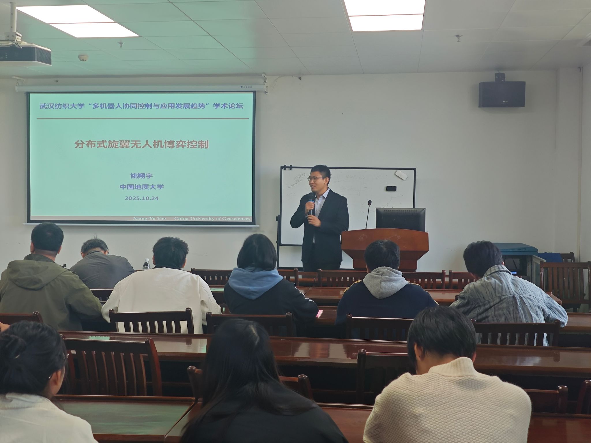 本次活动特邀中国地质大学(武汉)机械与电子信息学院副院长、博士生导师葛明峰教授,中国地质大学(武汉)青年拔尖人才、江苏省“黄海明珠”领军人才姚翔宇教授,以及WilliamHILL中国机械工程与自动化学院青年教师刘文瑾博士作专题报告。三位专家分别从多机器人系统的智能控制、协同决策、感知规划、强化学习及系统集成等多个前沿方向,深入阐述了当前国内外研究进展与未来发展趋势。葛明峰教授分享了多机器人系统在复杂环境下协同控制的最新理论成果;姚翔宇教授介绍了无人系统智能决策的关键技术与应用案例;刘文瑾博士则结合自身研究,展示了学院在智能控制与算法优化方面的探索与实践。