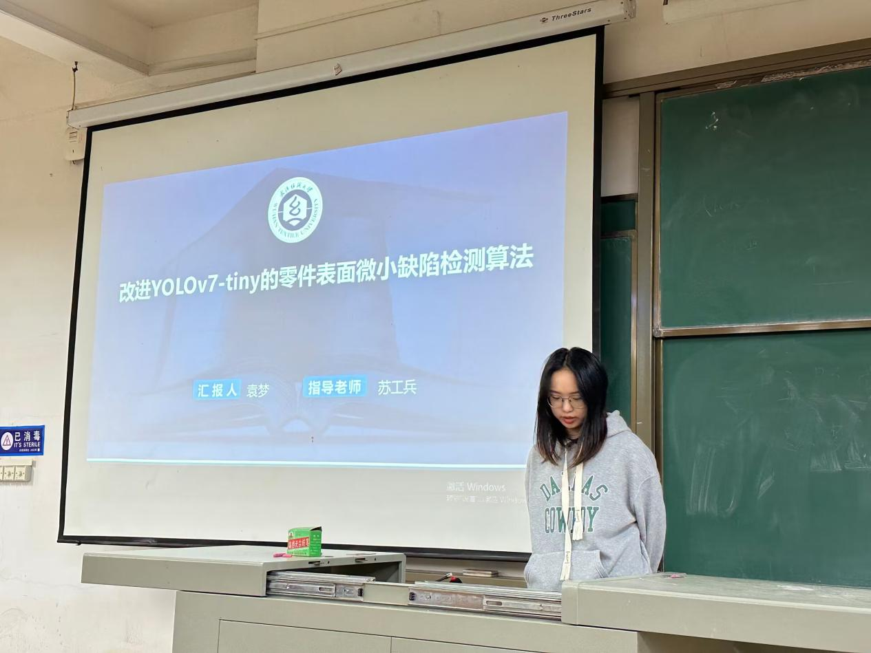 袁梦同学的分享主题是“改进YOLOv7-tiy的零件表面微小缺陷检测”。罗教授针对赵俊杰同学的分享给出了建议:一是建议袁梦同学在分享交流时增加与台下同学们的互动交流,适时调整自己分享的语速快慢等;二是实验数据偏少,不具有普遍意义,要想具有说服力,要有充足的数据支撑;三是提议袁梦同学对课题可以进行适当的扩充,让课题显得更加充实饱满。