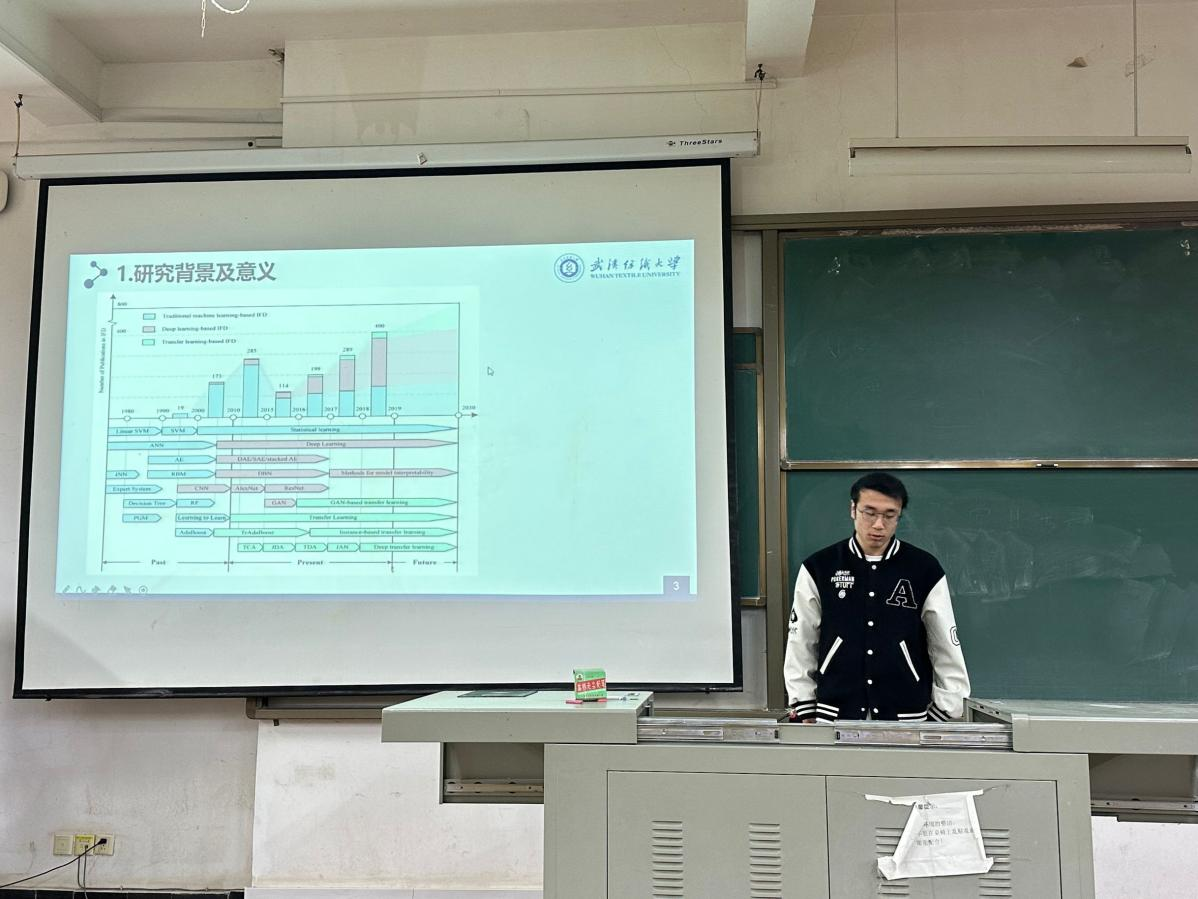 王浩然同学分享了“基于机器学习的并条机故障诊断方法研究”,沈忱老师针对王浩然同学的分享主要给出了建议,一是项目方面预处理之后的工序要理清楚,明白自己的下一步研究目标;二是进度可以再加快一些,深度学习的基础上往后再推敲。