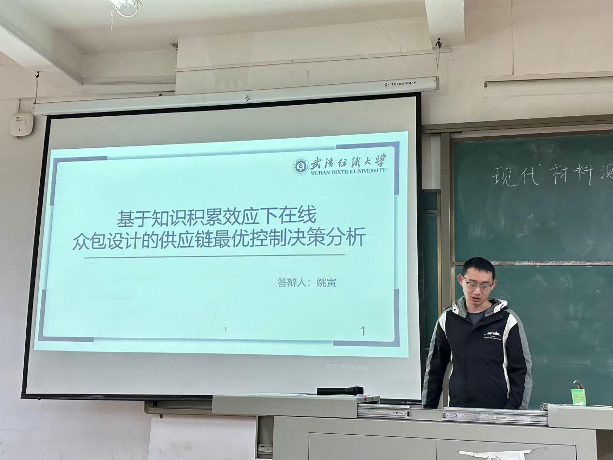 姚寅同学分享了“基于知识积累效应下在线众包设计的供应链最优控制决策分析”。徐巧老师针对王浩然同学的分享给出了建议,一是项目方面预处理之后的工序要理清楚,明白自己的下一步研究目标;二是项目进度可以再加快一些。