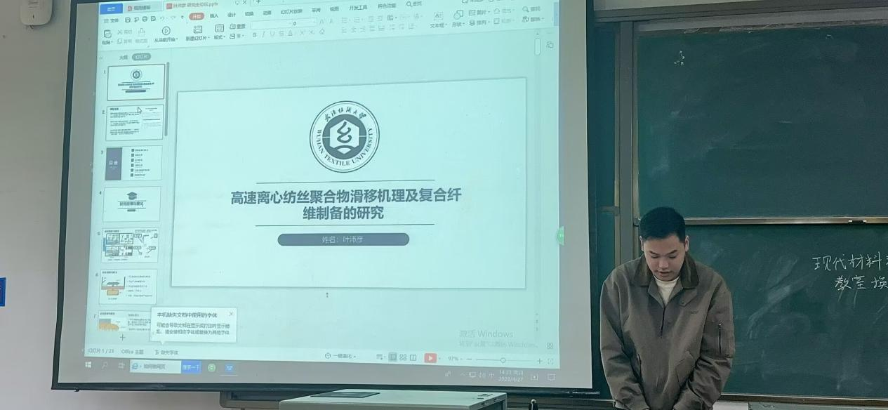 叶沛彦同学介绍了他的研究课题“高速离心纺丝聚合物滑移机理及复合纤维制备的研究”。他深入探讨了高速离心纺丝聚合物滑移机理的研究,并展示了在复合纤维制备方面的应用潜力。左小艳老师对叶沛彦同学的分享给出了建议:论文思路清晰,分析透彻,创新性较高,赞扬了叶沛彦同学的研究成果,研究成果有一定的实用性和推广价值。