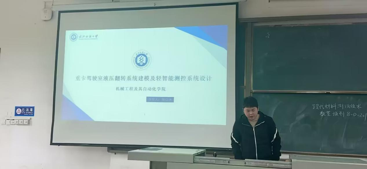 周信泽同学分享了他的研究课题“重卡驾驶室液压翻转系统建模及轻智能测控系统设计”。左小艳老师针对周天都同学的分享给出了建议:1.其汇报中存在一些理论和实践之间的不够贯通,需要进一步完善研究设计和实验方案;2.整个课题的实验目的不是很明确,要把分析参数与实际情况对应。