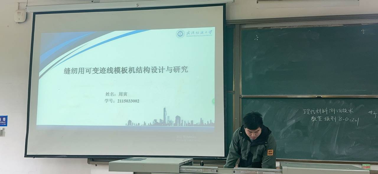 周寅同学分享了他的研究课题“缝纫用可变迹线模板机结构设计”。他讲解了所设计的缝纫用可变迹线模板机的结构设计原理和优势,并展示了实际应用中的效果。左小艳老师针对周寅同学的分享给出了建议:实物织板做得好,论文中存在一些表述不够清晰的问题,需要进一步完善语言表达和逻辑思维能力,可以多一些理论,与现有应用相结合。