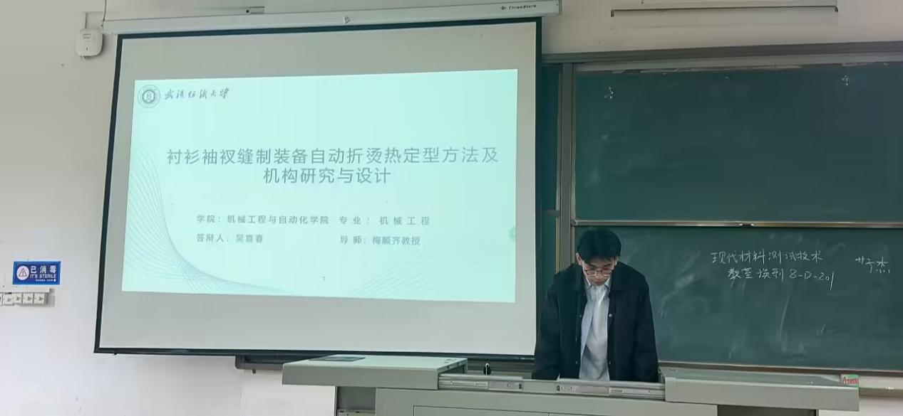吴喜春同学分享了他的研究课题“衬衫袖衩缝制装备自动折烫热定型方法及机构研究与设计”。他介绍了在衬衫袖衩缝制装备中,如何实现自动折烫热定型的方法,并详细阐述了他的研究成果和设计方案。左小艳老师对吴喜春同学的分享给出了建议:1. 课题是偏机构还是偏理论显得不突出;2.结构清晰,内容严谨,论据充足,展示了较高的研究水平和学术素养。建议吴喜春同学继续深入探究相关领域的研究,进一步提高研究成果的实用性和应用性。