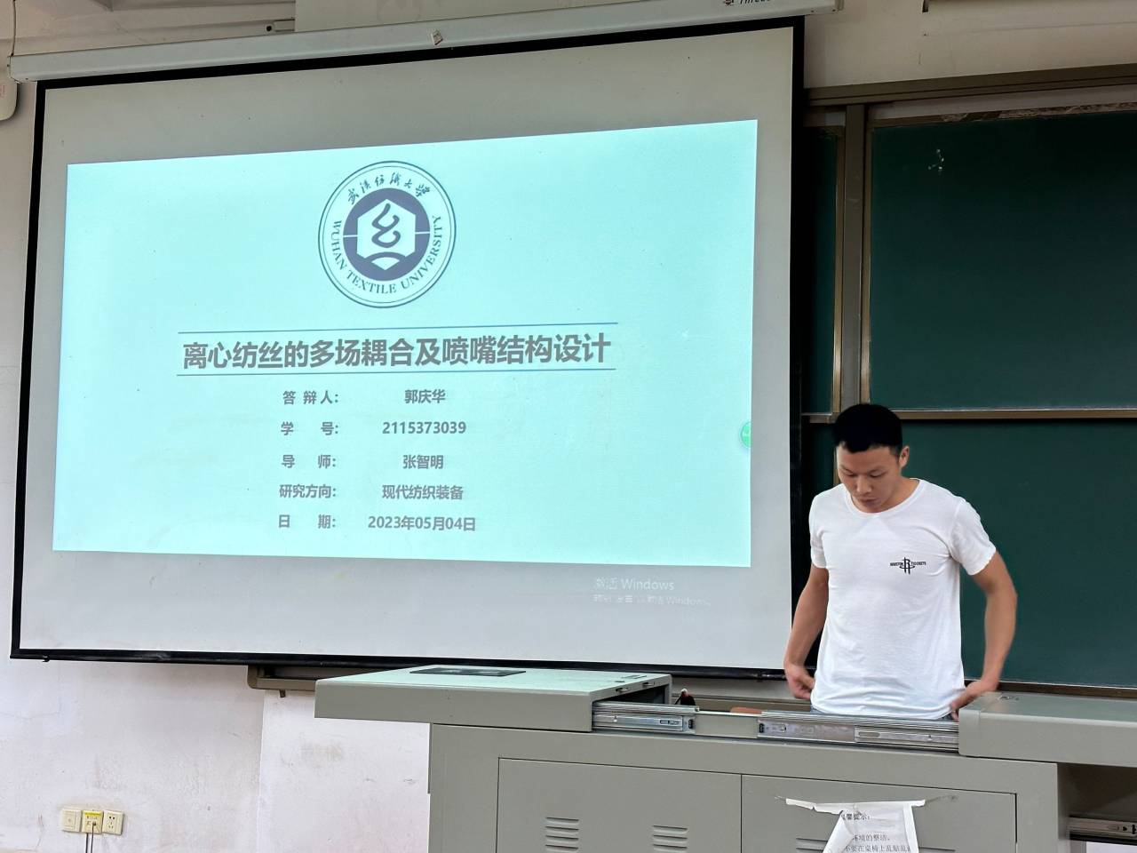 郭庆华同学介绍了他的研究课题“离心纺丝的多场耦合及喷嘴结构设计”。他深入探讨了离心纺丝过程中多场耦合的机理,并重点介绍了他在喷嘴结构设计方面的研究成果和创新点。张成俊教授对郭庆华同学的分享给出了建议:1.其论文思路清晰,分析透彻,创新性较高,研究成果有一定的实用性和推广价值;2.提出如下问题:实验的创新之处是什么?复合材料?算法?研究目的是什么?