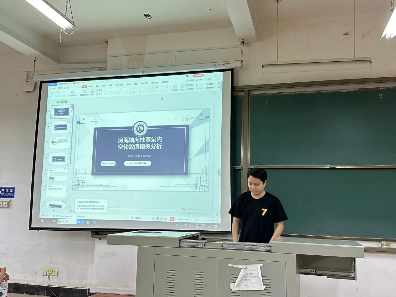 赵梓港同学介绍了他的研究课题“深海轴向柱塞泵内空化数值模拟分析”。他详细介绍了深海轴向柱塞泵的内部空化问题,并展示了他利用数值模拟方法对该问题进行分析的结果和结论。张成俊教授针对赵梓港同学的分享给出了建议:1.是否有实物?实物和文献是否对应?2.未来研究目标一定把问题标明,还有哪些问题没有解决需明确。要有系统思维,充分结合理论和实际。