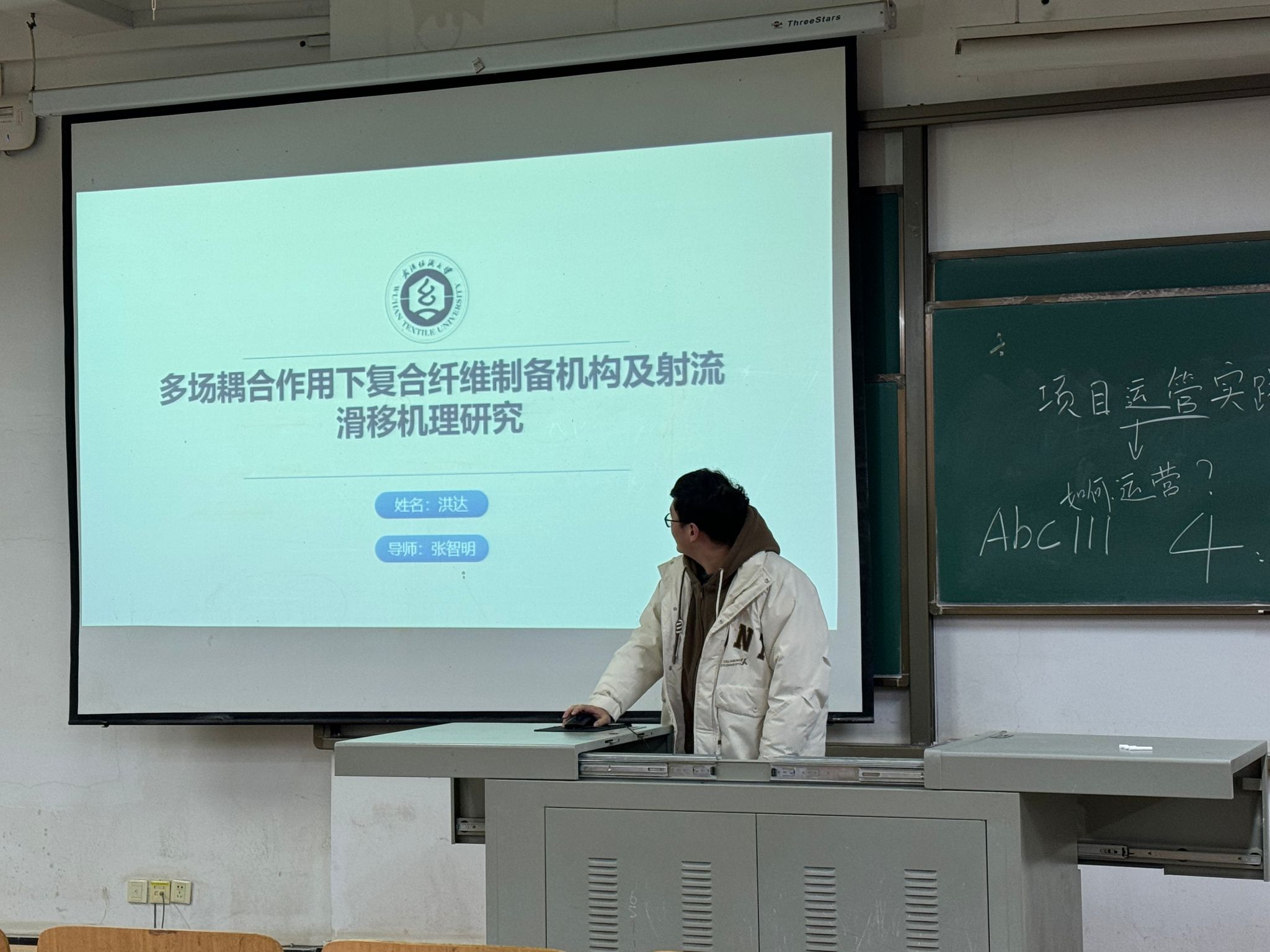 洪达同学分享了他的研究课题“多场耦合作用下复合纤维制备机构及射流滑移机理研究”。其研究的目标是多场耦合:温度场、湿度场、流场对复合纳米纤维制备的影响,纺丝溶液射流运动过程中发生滑移、液-液滑移、气液-滑移的处理。
