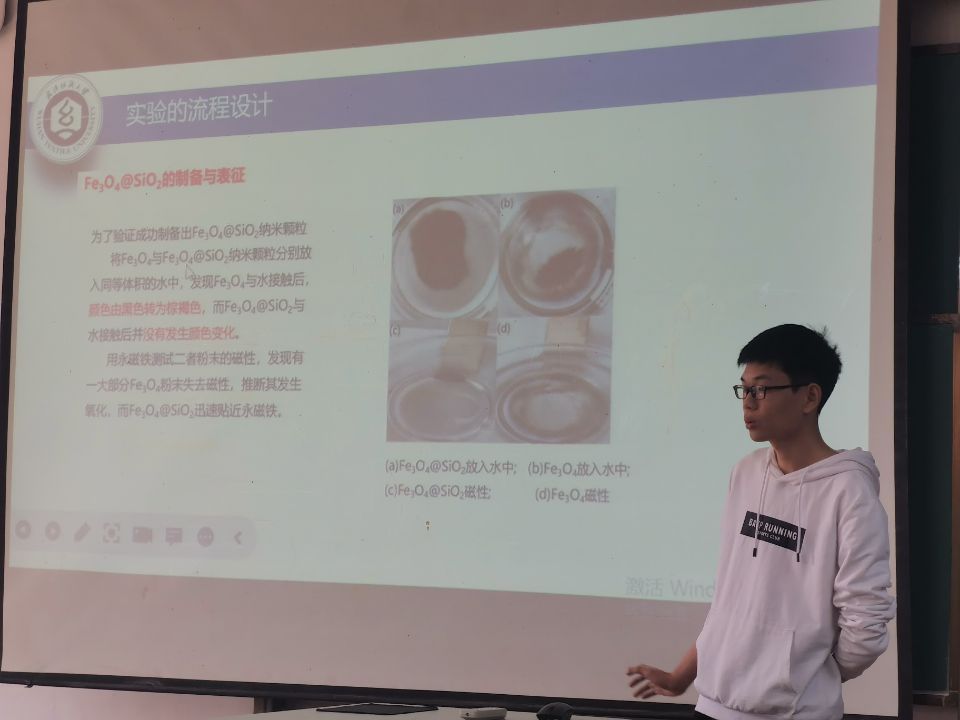 李梓龙同学分享了他的课题“铁,氮共掺二氧化钛光催化剂的制备及降解染料”,其研究的内容是纺织厂生产过程中会排放大量酸性染料废水,其染料分子中包含酸性基团,大部分属于偶氮染料,光催技术可以在光催化剂存在的情况下,利用太阳和空气可直接把许多有机污染物分解成为一些无机小分子物质,达到使有害物质分解的目的又不带来二次污染。