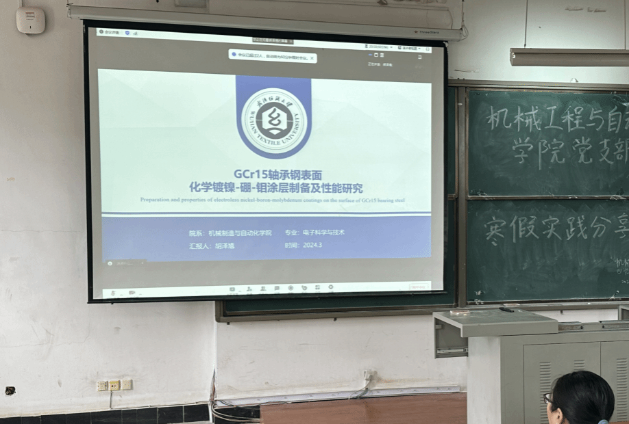 第二位是远在俄罗斯进行学习交流的胡泽馗同学线上分享他的研究课题“GCr15轴承钢表面化学镀镍-硼-钼涂层制备及性能研究”,从理论分析、实验分析和数据分析三个角度为大家介绍了目前课题的研究进展。孙教授从镀层基底金属类型和镀层方案等角度与其进行了充分交流。