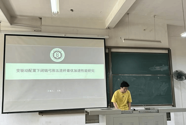王杰同学汇报的《变驱动配置下闭链弓形五连杆最优加速性能研究》课题中在变驱动配置下闭链弓形五连杆作为研究对象,对它的最优加速性能进行研究。找到了它的最优的加速性能。