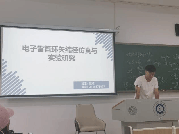 詹劲同学分享了他的课题“电子雷管环矢缩径有限元与仿真分析”,其研究内容是通过弹塑性理论对管件环矢缩径成形工艺进行微元数学理论分析以及基于环矢缩径的不同因素进行有限元模拟仿真,通过数据后处理得到影响规律。