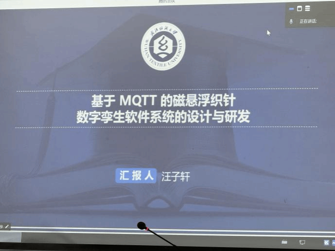 汪子轩同学线上分享了他的研究课题“基于MQTT的磁悬浮织针数字孪生软件系统的研究与开发”,研究的内容研究MQTT(消息队列遥测传输协议)的基本特性,了解其在物联网中的应用场景以及如何用于实现设备间的高效通信,讨论MQTT在数据传输效率、带宽利用、延迟等方面的优势。蔡旺老师指出,基于MQTT的磁悬浮织针数字孪生软件系统的研究与开发是一个综合性项目,涉及物联网、智能制造、数据分析及控制系统等多个领域,在于提升织造过程的智能化水平、实时监控能力和生产效率。
