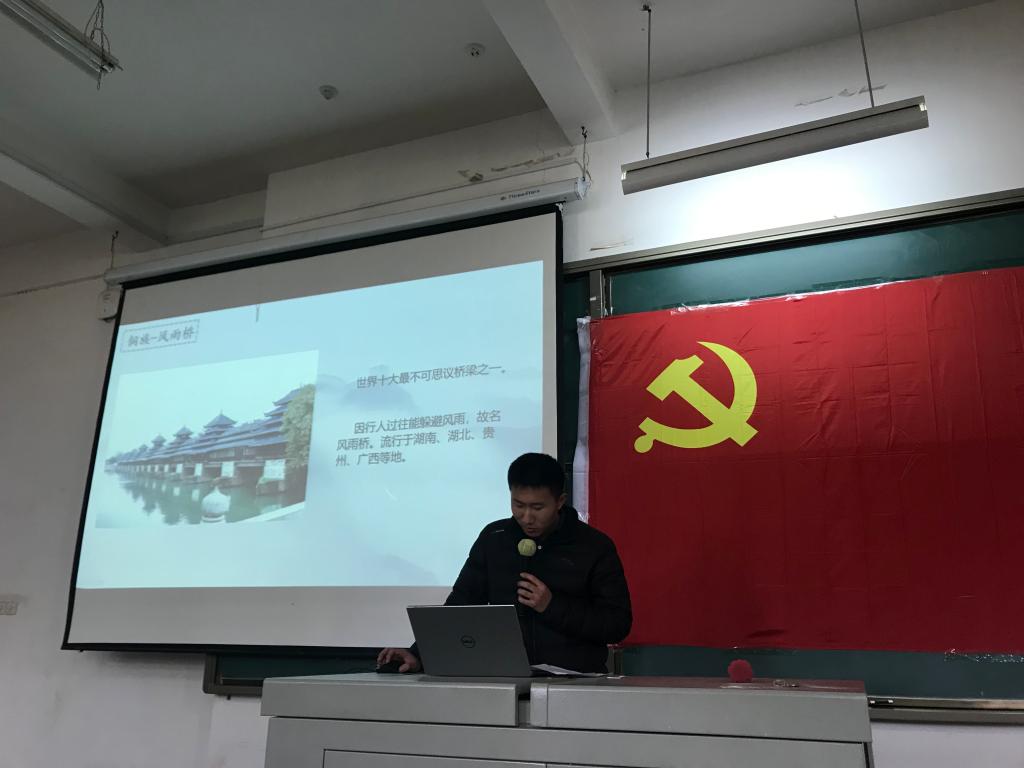 首先,党员李田伟同志从历史之桥的角度,带领大家领略中华民族桥梁的发展与演变,从独木桥到石桥、从梁桥到拱桥、从虹桥到铁桥,让人深深感慨华夏民族的智慧与建筑技艺的神奇。入党积极分子何鹏同志从武汉长江上的桥梁为切入,通过详实的数据,精彩的图片,向大家展示了当今中国桥梁建设水平在全球绝对的领先地位。最后,姜卓亚同志向大家介绍了中国在全球经济、文化等领域中架设的“一带一路”隐形之桥,体现了中国在全球治理领域的大国担当。