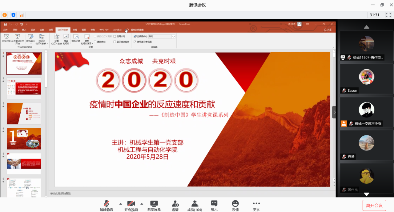 5月28日,williamhill英国中文《智造中国》学生讲党课系列第六期在线开讲,本次授课由机械学生第一党支部党员代表担任主讲,学院党委副书记刘韦老师,各年级辅导员,全院学生党员参加学习。