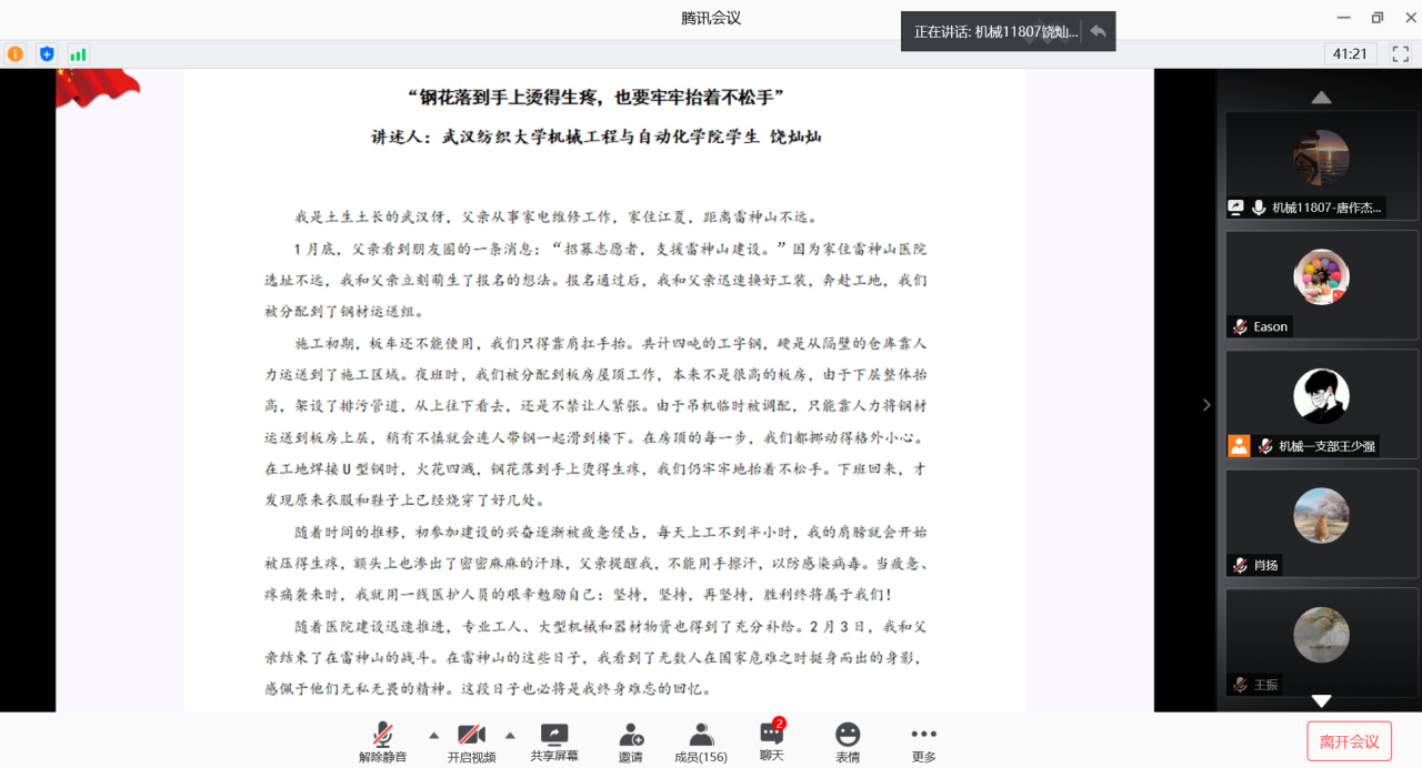 这次党课内容丰富,语言幽默诙谐。支部书记王娟老师带领我们认真学习习近平总书记围绕疫情防控工作的一系列重要讲话精神,贯穿着三个鲜明特征:鲜明的人民立场、强烈的担当精神、科学的思想方法。说到责任担当,我校18级饶灿灿同学在疫情严重期间积极参与到雷神三医院建设中,“钢花落到手上烫得生疼,也要牢牢抬着不松手”,他用实际行动践行纺大自强不息、经天纬地的精神,值得我们每一位同学学习。作为新时代的建设者和接班人,我们应当拥有不怕苦,不怕累的坚强精神,为全面建成小康社会贡献自己的力量。