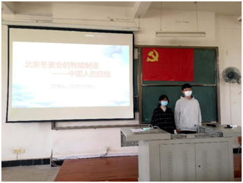 紧接着,学生一支部代表杜雨柯和胡锦杰同志给大家带来“北京冬奥会的智能智造——中国人的自信”主题党课。两位同志首先向我们展示了此次北京冬奥会上的“黑科技”,如:我国第一台自主研发的雪蜡车,开幕式上全球最大的8k超高清地面显示系统,全身碳纤维结构由3D打印的奥运火炬“飞扬”等。其中重要介绍了600多名演员与脚下雪花紧紧跟随的表演中,依托机器视觉AI技术,实现了自由行走代替标记点的表演模式,600多人在如此大规模的落地屏幕上被集体抓拍并实时互动,在全球尚属首次。中国已经能够从容自如的办好冬奥会并让世界为之惊叹,向全世界展现了中国拥抱世界团结世界、积极建设人类命运共同体的憧憬。作为当代大学生,我们应该从党的百年奋斗历程中获得宝贵的经验与财富,继续牢记初心使命、强化担当作为,为实现第二个百年奋斗目标和中华民族伟大复兴的中国梦而不懈努力。