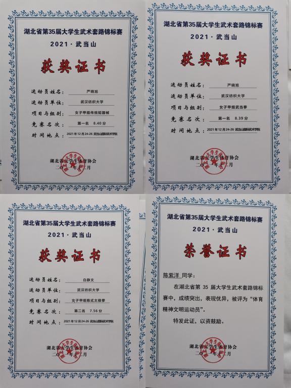 1224日—27日,湖北省第35届大学生武术锦标赛在武当山国际武术学院举行。我院学子严晓旭、白静文、陈紫洋同学斩获多项大奖,名扬武当山。据悉,本次比赛由湖北省大学生体育协会主办,武汉体育学院、武当山国际武术学院、武当山旅游经济特区武术推广中心承办。比赛吸引了武汉大学、华中师范大学和中国地质大学等全省27所大学,近300名运动员、教练员参加。