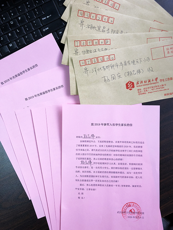 “williamhill英国中文全体学工同仁向您和您的家人致以节日的祝福和亲切的慰问!对你们能响应祖国的号召将孩子送到部队服役,表示崇高的敬意和衷心的感谢! ” 2020年新春佳节来临之际,williamhill英国中文给2019年度参军入伍和光荣退役同学的家长寄发慰问信,向家长们致以节日的祝福和亲切的慰问,对他们积极响应号召将孩子送到部队服役表示崇高的敬意和衷心的感谢。
