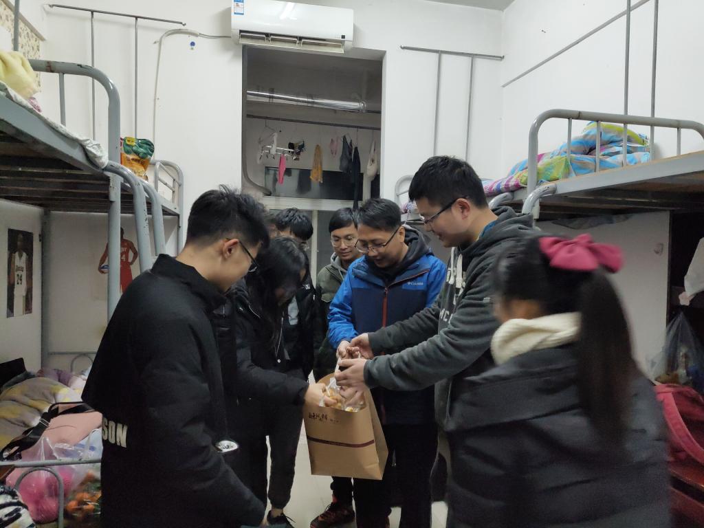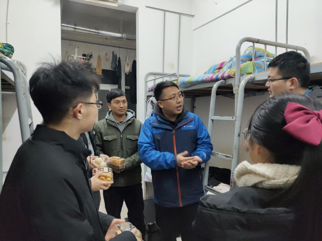 在宿舍里,刘韦副书记和辅导员老师对同学们不畏严寒,在校坚持集训备赛的精神表示充分肯定,亲切询问大家在校生活起居、回家车票是否买好等情况,叮嘱大家在校期间要注意寝室用电安全,保管好个人财物,与家人、老师保持联系。在了解到大家每天高强度的集训安排后,刘书记勉励大家一定要珍惜集训的宝贵时光,多向数计学院指导老师学习请教,树立信心、不断拼搏、挑战自我、开拓创新,争取取得优异成绩,为学校争光。