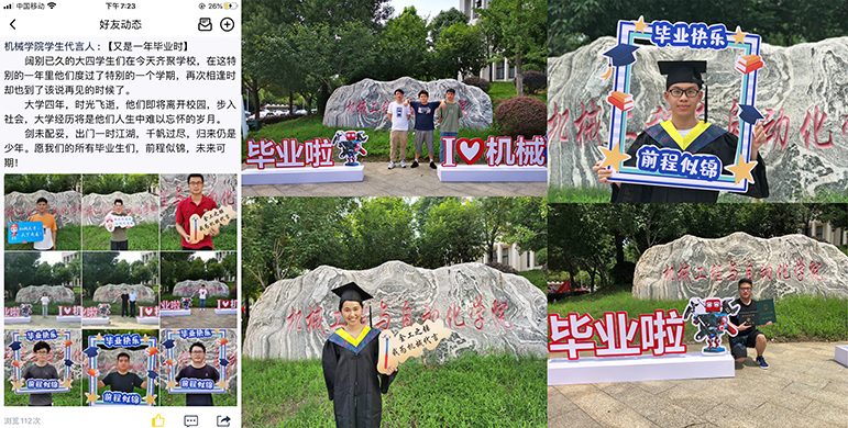为了让同学们拍出更有意思的纪念照,williamhill英国中文特别“花巨资”制作了“毕业啦”“I爱机械”PVC亚克力立体字,摆放在学院院名石前。立体字上扛着锤子、扳手等金工加工工具的小机器人,体现了williamhill英国中文的专业特色;爱机械的“爱”字被大大的爱心图案替代,表达着同学们对母校对学院的无限热爱。学院还制作了带有“毕业快乐”、“前程似锦”字样的拍照框,向毕业生们表达母校的祝福。