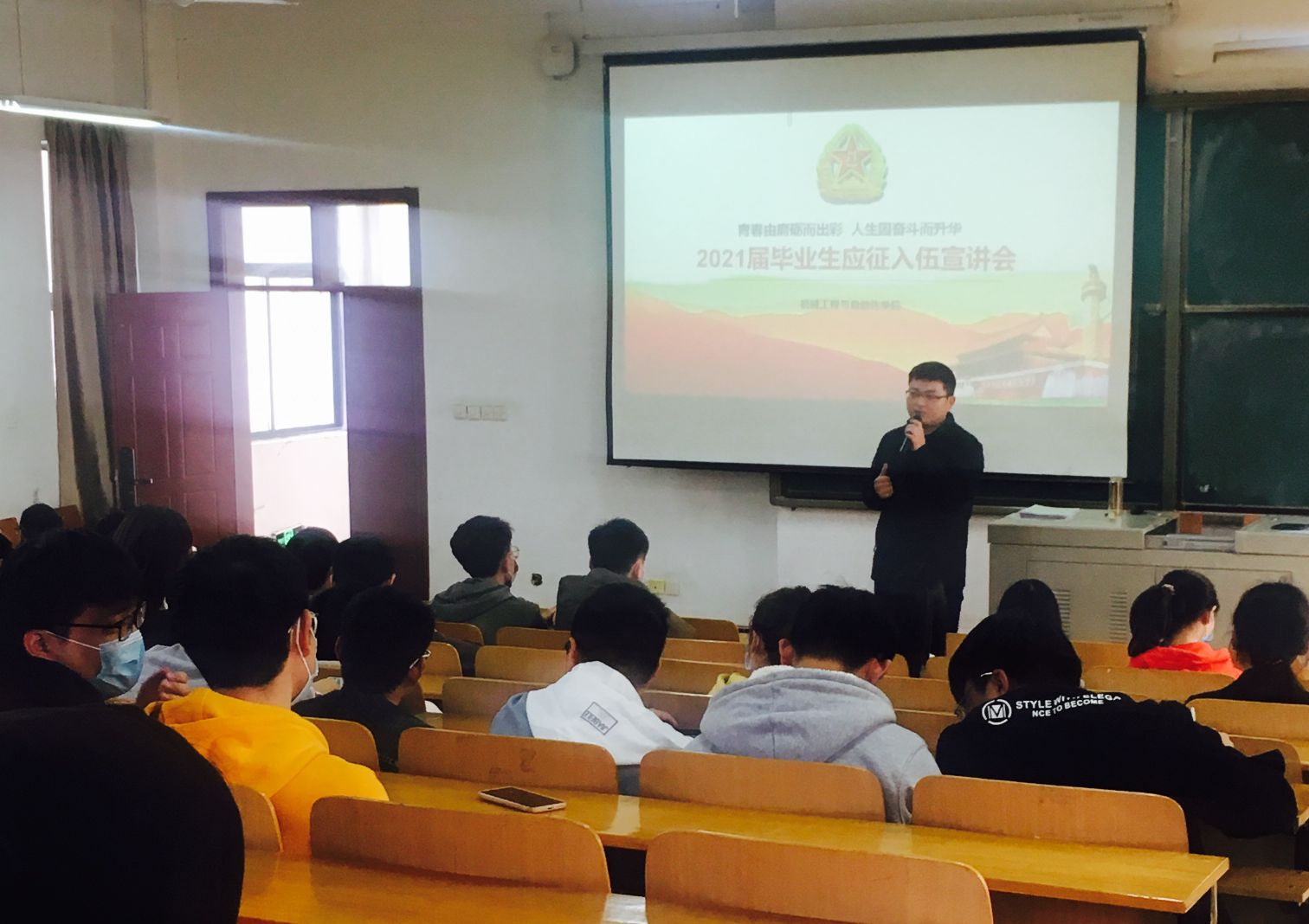 首先,2017级辅导员孙毅老师对目前学院就业情况做了简要介绍,并就当前就业形势做了分析与解读,号召并鼓励大家积极参军,建功军营。然后,孙老师组织大家观看了2021年征兵宣传片,就征兵相关政策进行解读。最后,结合自身入伍亲身感受,以及今年通过士兵专项计划考取研究生的2名同学的案例,向大家做了交流与分享,并现场解答了大家的提问。进一步帮助同学们了解掌握国防知识,鼓励应征大学生献身强军事业,现场交流气氛热烈。