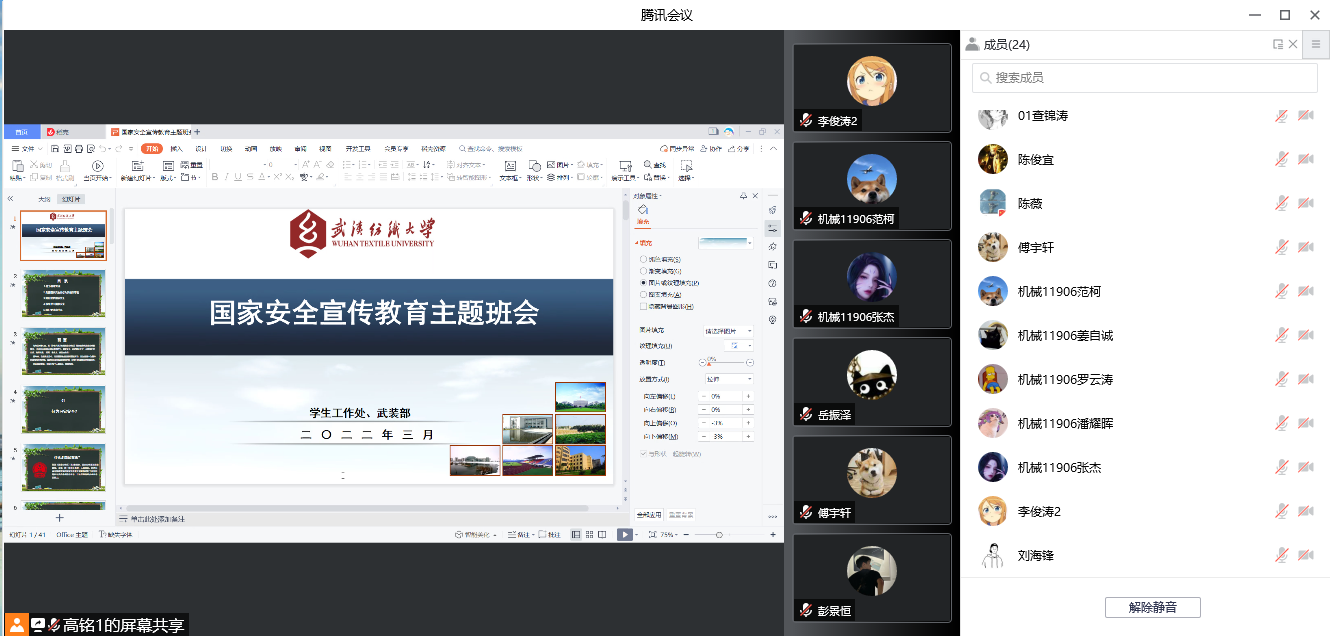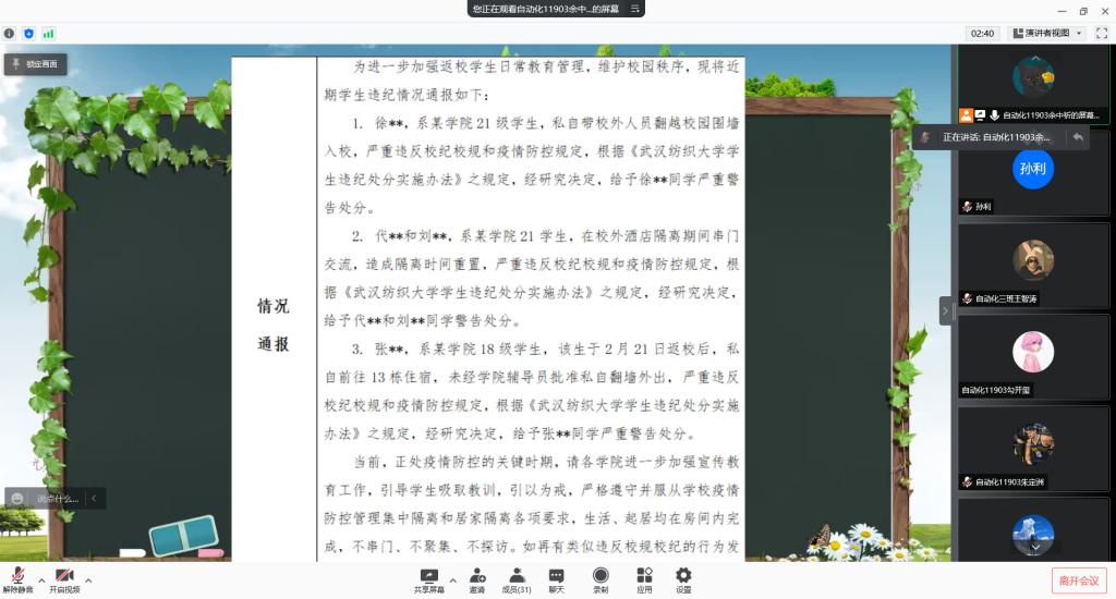 班会前,学院对各年级的宣讲内容进行了严格审核,确保主题班会政治方向正确、体现党中央最新精神、不涉及国家秘密。因疫情防控需要,班会由各班主任组织在线上开展,覆盖学院全体学生。