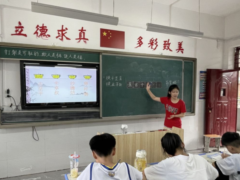 (支教老师唐予言正在教孩子们学习基本笔画与字体结构)