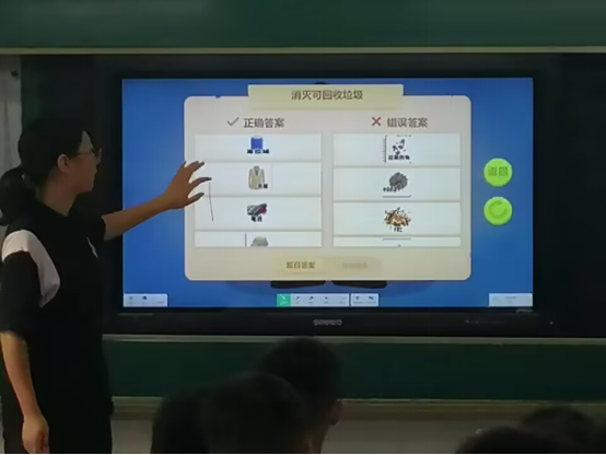 支教老师们准备了4个小游戏,分别是:消灭可回收垃圾、消灭湿垃圾、消灭有害垃圾、消灭干收垃圾。一个小游戏挑选两组小朋友来进行,让小朋友完全参与到课堂学习中。小朋友们面对这些小游戏跃跃欲试,迫不及待地举手,都想要自己来进行分类。在小朋友们通关后,老师们又带领小朋友们一起学习正确的垃圾分类,对学习到的知识进行复习巩固。