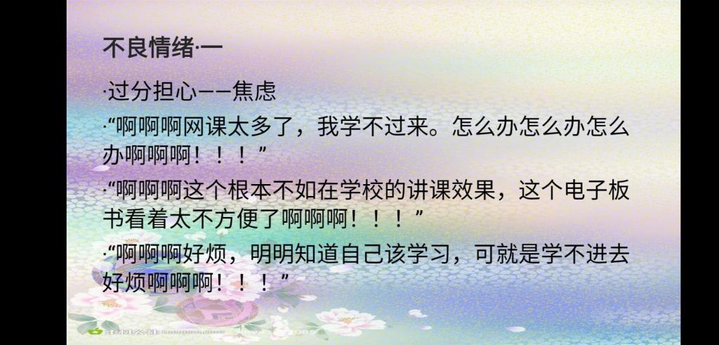 培训会主要包括三个内容:两种易发的极端的不良情绪,出现不良情绪的应对方法,心理咨询求助渠道。由于特殊时期在家线上学习,疫情和学业双重心理压力之下,情绪发生暂时的,短期的波动都属于正常现象,大多可以通过交流引导来排解。 可能部分同学会出现过分紧张的焦虑情绪,或是过分放纵的厌学情绪。大多是可以通过保证休息,劳逸结合;指定时刻计划表;和同学朋友一起线上互相监督来提高自己的学习效率。一旦感觉自己每天都有所精进,学习的不良情绪也就大多有所缓解。也可以与心理委员、老师进行沟通,必要时就医。