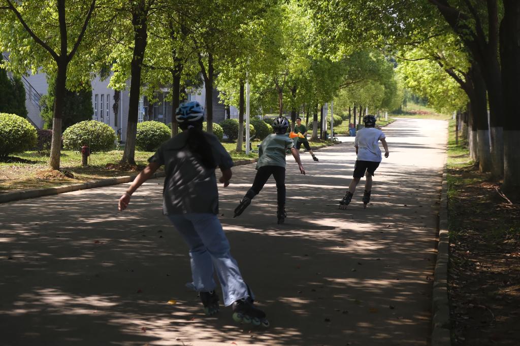 活动在操场外围400m长水泥地以折返接力方式进行,方式为滑板先行,自行车最后,同时三个类型项目之间间隔一定时间,累加计时方式进行。避免了滑板、轮滑和自行车同时出现在赛场上的情况,降低了发生碰撞的风险。同时3个社图分别派出一人,累计三人组成一队,促进了三个社团成员间的认识和交流机会。