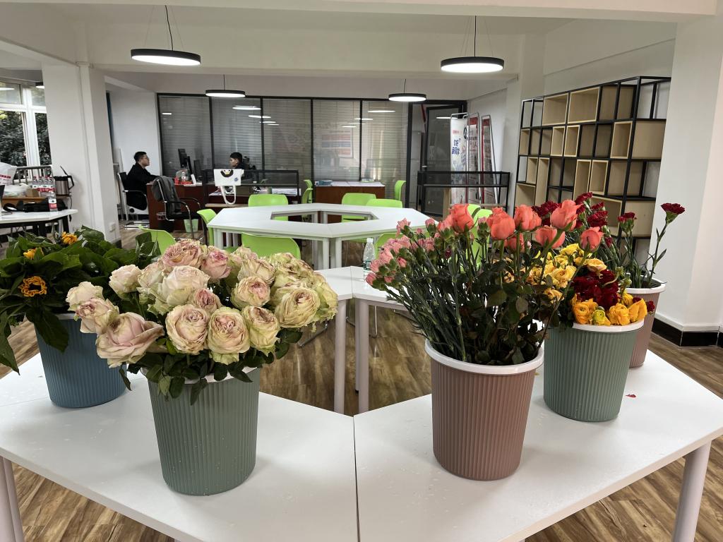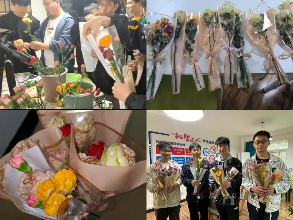 机械12206班熊志豪一边选花,一边学着用包装纸包扎花束,虽然略显笨拙,但是开心的笑容始终洋溢在脸上,“我从来没有做过花艺,手被花刺剌了几道印子,但是想着能为班上女同学送上礼物,心里也暖洋洋的,真的体会了送人玫瑰手留余香的感受!”经过大家不懈努力的制作后,男同学们都成功制作出了一束束精美的花束礼品。