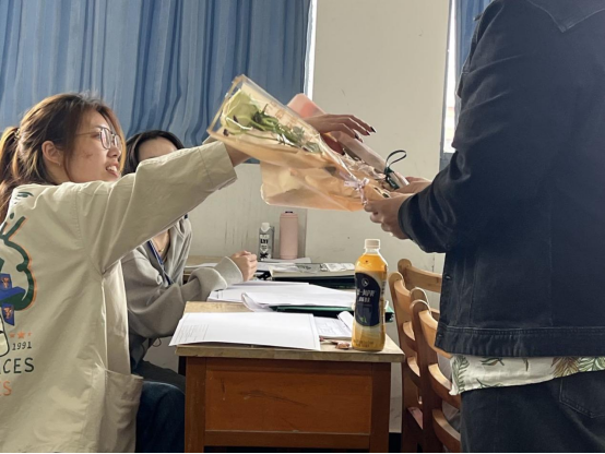 (男同学们把亲手制作的节日花束送到女同学们手中)